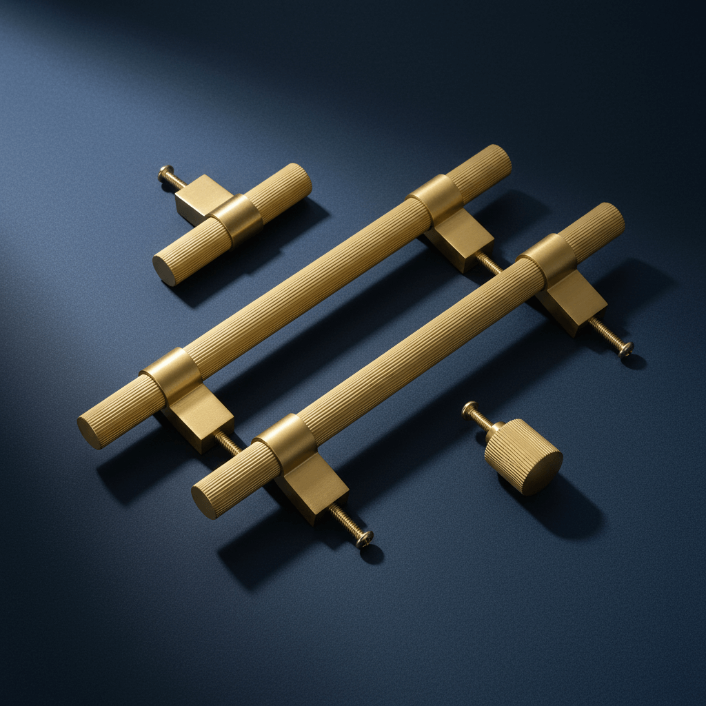 Maniglia in ottone massiccio per ante da cucina o mobili, caratterizzata da una finitura zigrinata in stile industriale. Il design essenziale presenta una lavorazione lineare lungo tutta la lunghezza della maniglia, con una piastra di fissaggio quadrata in ottone spazzolato. Perfetta per cucine moderne dove pulizia delle linee ed eleganza vanno di pari passo. La maniglia è realizzata in ottone massiccio e trattata con una speciale coating per una finitura impeccabile e una superficie protetta nel tempo. Abbinala a pomelli o barre a T della serie 3138 per un look completo e armonioso.